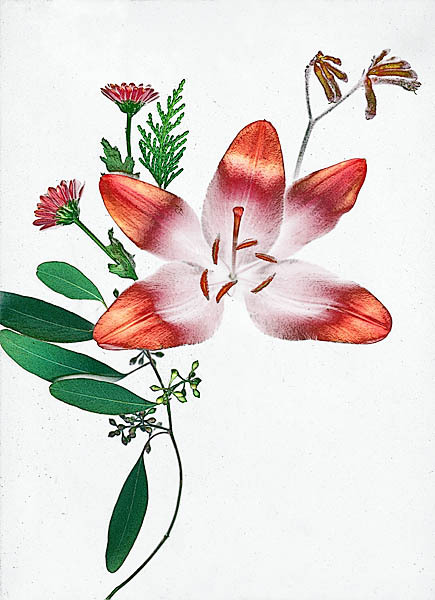 Happy Holidays! I am working on my Christmas card this year. I am having trouble finding inspiration. I bought a winter bouquet from Trader Joes and tried it arrange it in the Ikebana style. I fiddled the scan for the white background and added grunge with an etch tone filter.
