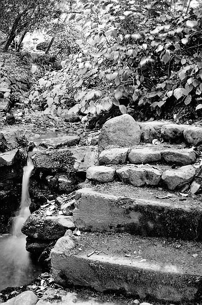 This is another shot from my archive raid. This started as a fisheye shot bracketed by 4 stops and merged into an HDR. I did not like the resulting color so it became a B&W. Next, I gave it a heavy crop on stairs to remove some clutter. I like how the stone lantern is circled in light but the shot was not read well. I did a flip horizontal and voila a much better entry into the photo.