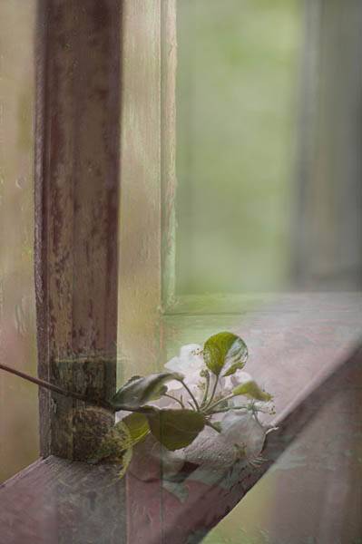 A composite of two images from the ‘Haunted House’. The windows was gone and this apple blossom was laying along the window sill. The other image is a shot of the front door.