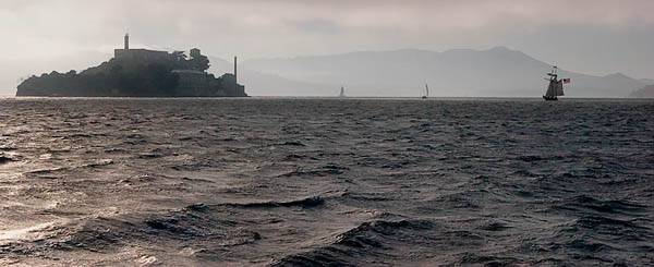 This one is from way back in the archives. This was taken last year around this time when the tall ships visit San Francisco. We went out on one of the ships for a cruise under the Bay Bridge, past Alcatraz to the Golden Gate Bridge and back. This one was never posted. It is the Lynx sailing past Alcratraz.